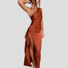 The Cecil One-Shoulder Pleated Dress combines graceful pleats with a striking one-shoulder design, making it a show-stopping addition to your wardrobe. Perfect for formal events or evening outings, this maxi dress exudes timeless sophistication.