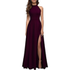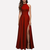 This adult bridesmaid dress features a halter neckline and a low back, offering a graceful and sophisticated style. The gathered waist and flowing skirt with an asymmetrical hemline create a flattering silhouette, perfect for weddings and formal occasions. The dress is designed to complement other bridal party attire while ensuring a chic, elegant look.