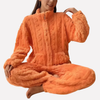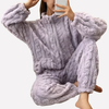 This women’s fleece pajama set includes a long-sleeve zip-front top and matching pants, designed for restful nights and laid-back mornings. The zip closure on the top makes it simple to put on and take off, while the full-length pants offer extended coverage. Side pockets on the pants provide space for small items, and the fleece surface delivers warmth through cooler evenings.