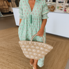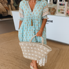 Step into the season with this graceful V-neck dress, combining bohemian flair with flattering structure. Its lightweight fabric, pleated high waist, and lantern sleeves make it a go-to for beach days, vacations, and breezy summer evenings.