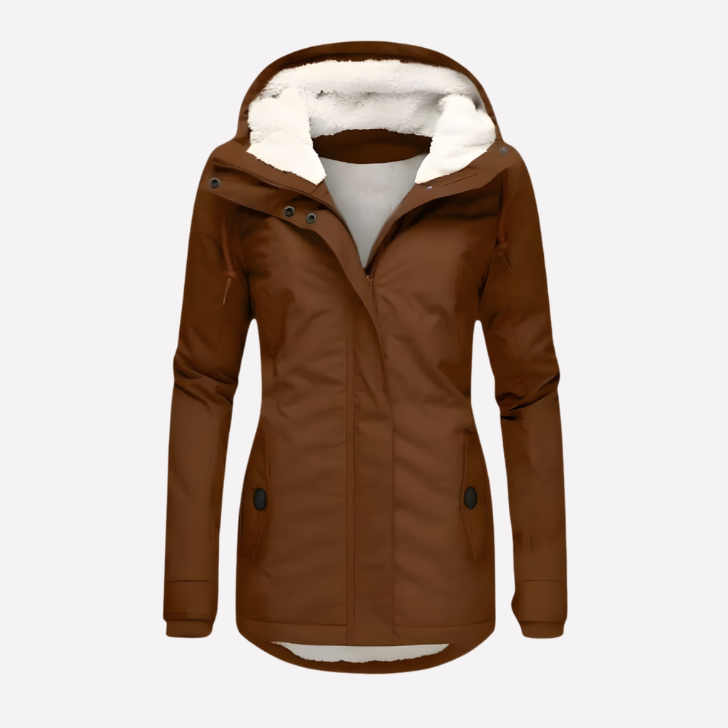 This women’s winter coat features a lined interior and an attached hood for defined coverage during cooler seasons. The full-length front closure creates a sleek profile, while the extended silhouette supports layered outfits. Side pockets offer space for small essentials, and the overall design pairs well with trousers, skirts, or knitwear for varied seasonal looks.