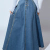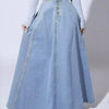 The skirt is a timeless addition to your wardrobe, seamlessly blending casual elegance with a touch of vintage charm. Crafted from a durable denim blend, this high-waisted A-line skirt features a front button closure, making it perfect for both everyday wear and special occasions.